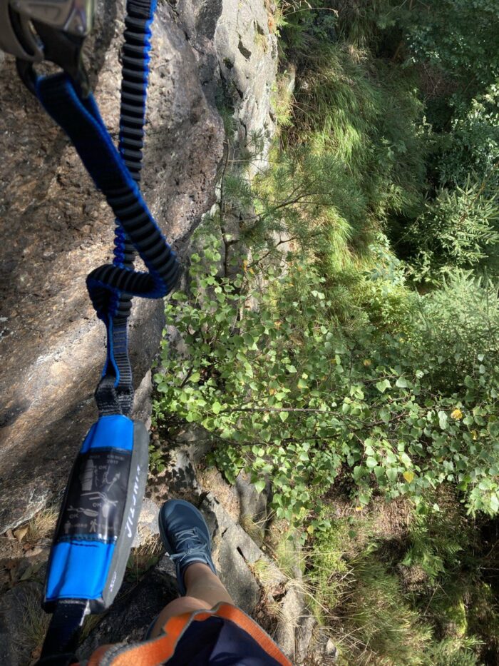 Co se týče výbavy, základní je mít tzv. sedák/sedací úvazek, tlumič pádu s ferratovou brzdou, samozřejmě přilbu, pevnou obuv na turistiku s dobrou podrážkou k lezení na skalách (já lezu většinou v trekových botech Altra nebo v robustnějších kotníkových turistických botech Asolo, a pro inspiraci můj parťák využívá barefoot turistické botky Merrell), rukavice (za mě stačí nějaké starší na kolo, zabrání odírání rukou o lana a další nechtěná zranění). Doporučuje se mít i tzv. odsedku, kterou 100 % doporučuji i já, ulehčí ti hodně práce, především v exponovaných úsecích. Jedná se totiž o kratší lano s karabinou navíc, což ti umožňuje si „odsednout“ nebo zavěsit se do sedáku a odpočinout si.
